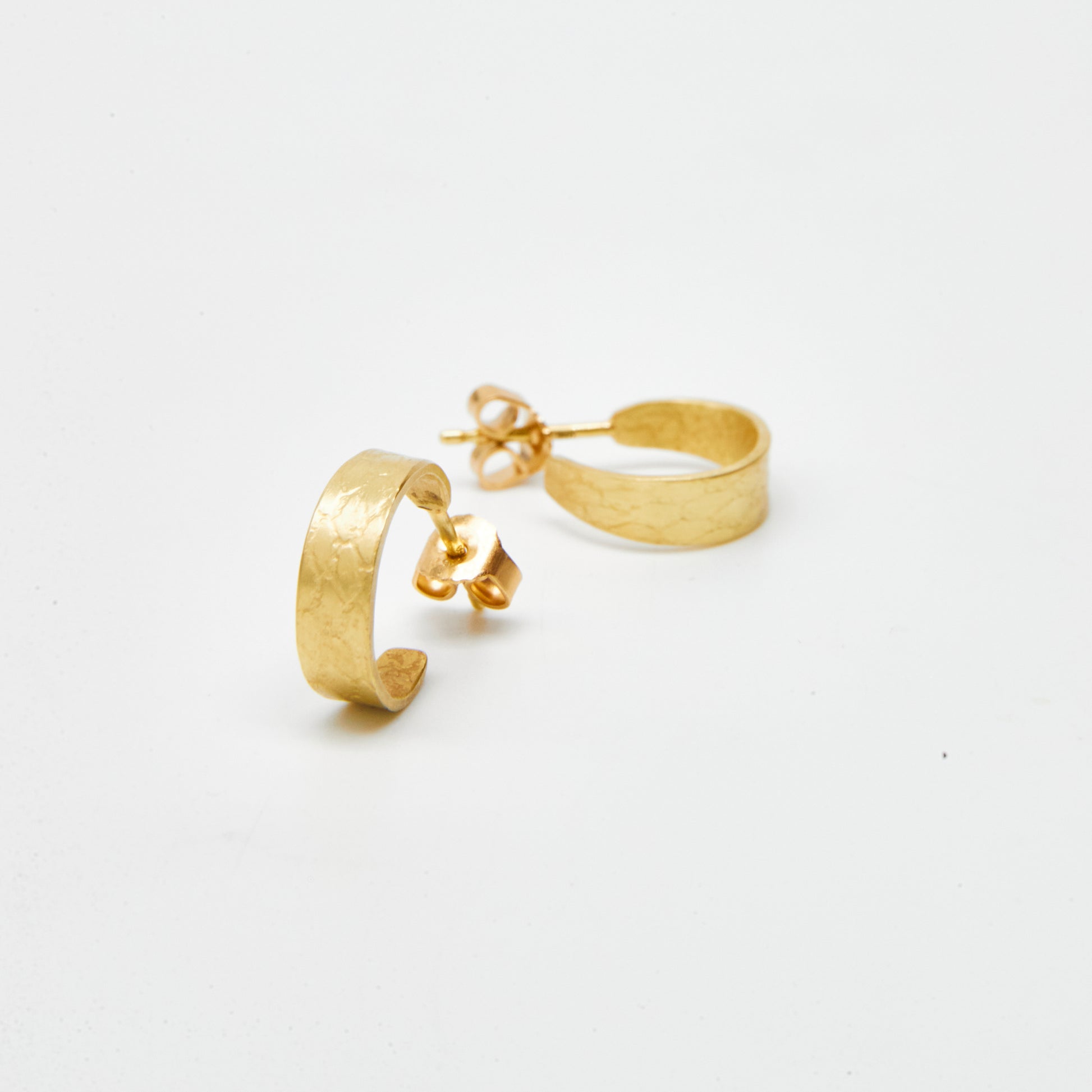 Diese besonders schönen Creolen haben eine angenehme Breite. Sie sind aus 18kt Gelbgold gefertigt und ihre Oberfläche ist geprägt.