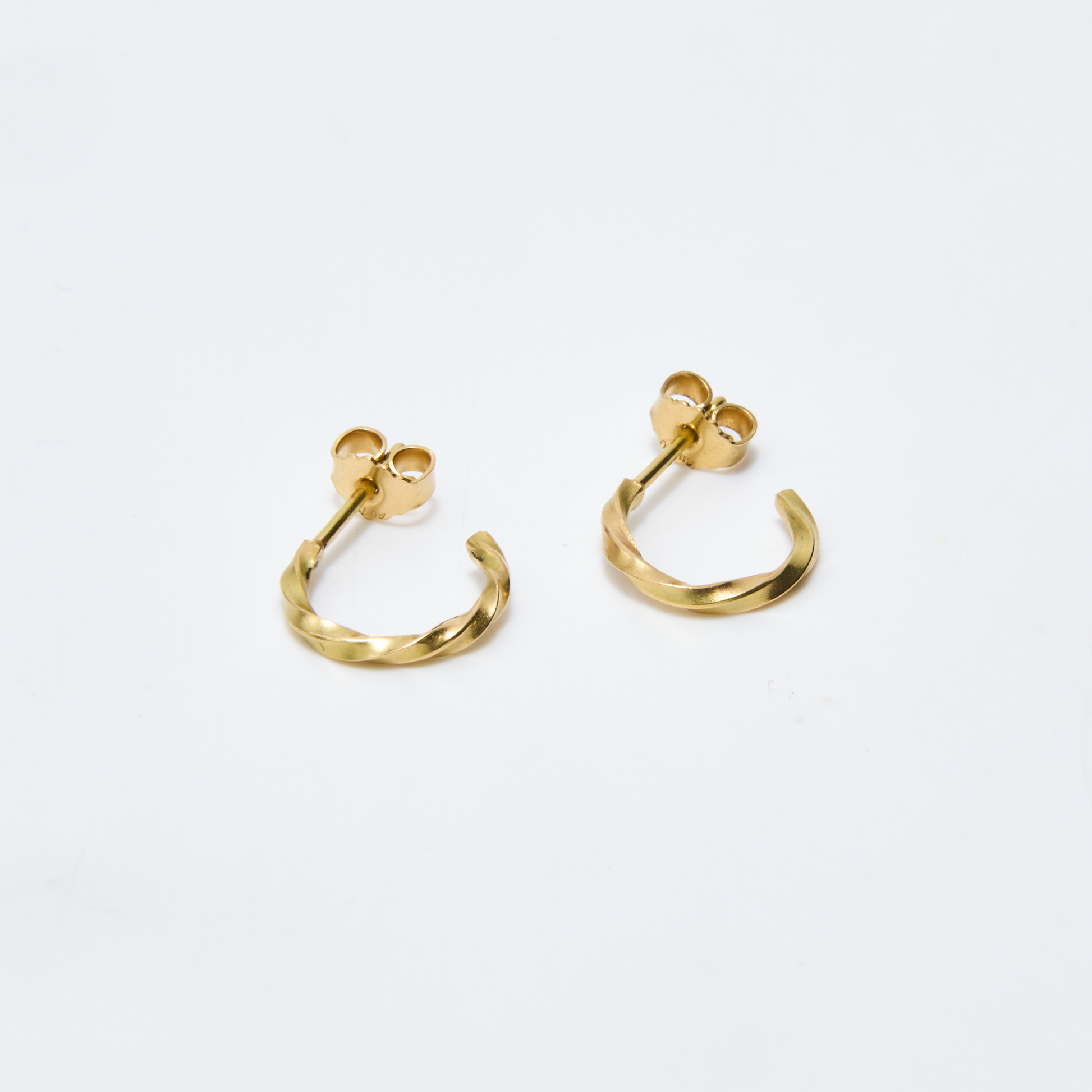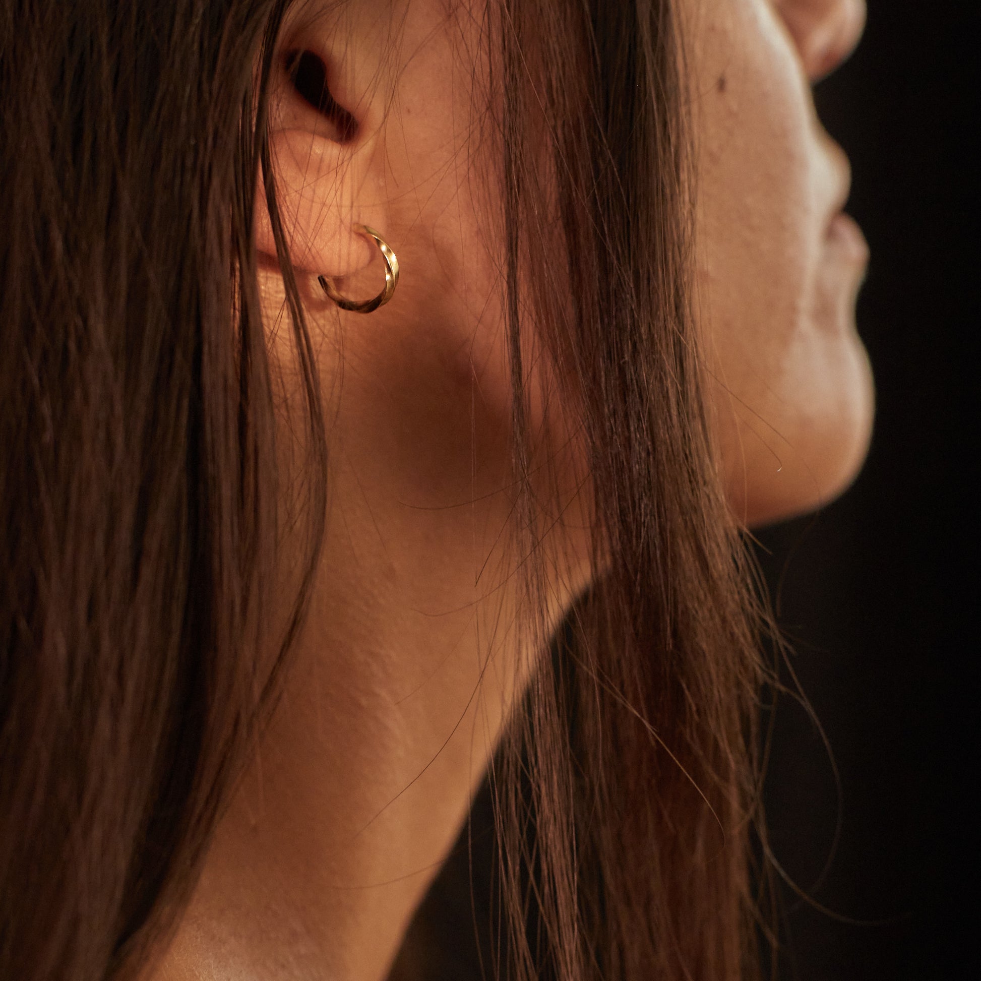 Diese ganz zarten Creolen sind in sich verdreht. Sie stülpen sich gerade um das Ohrläppchen und zieren es.