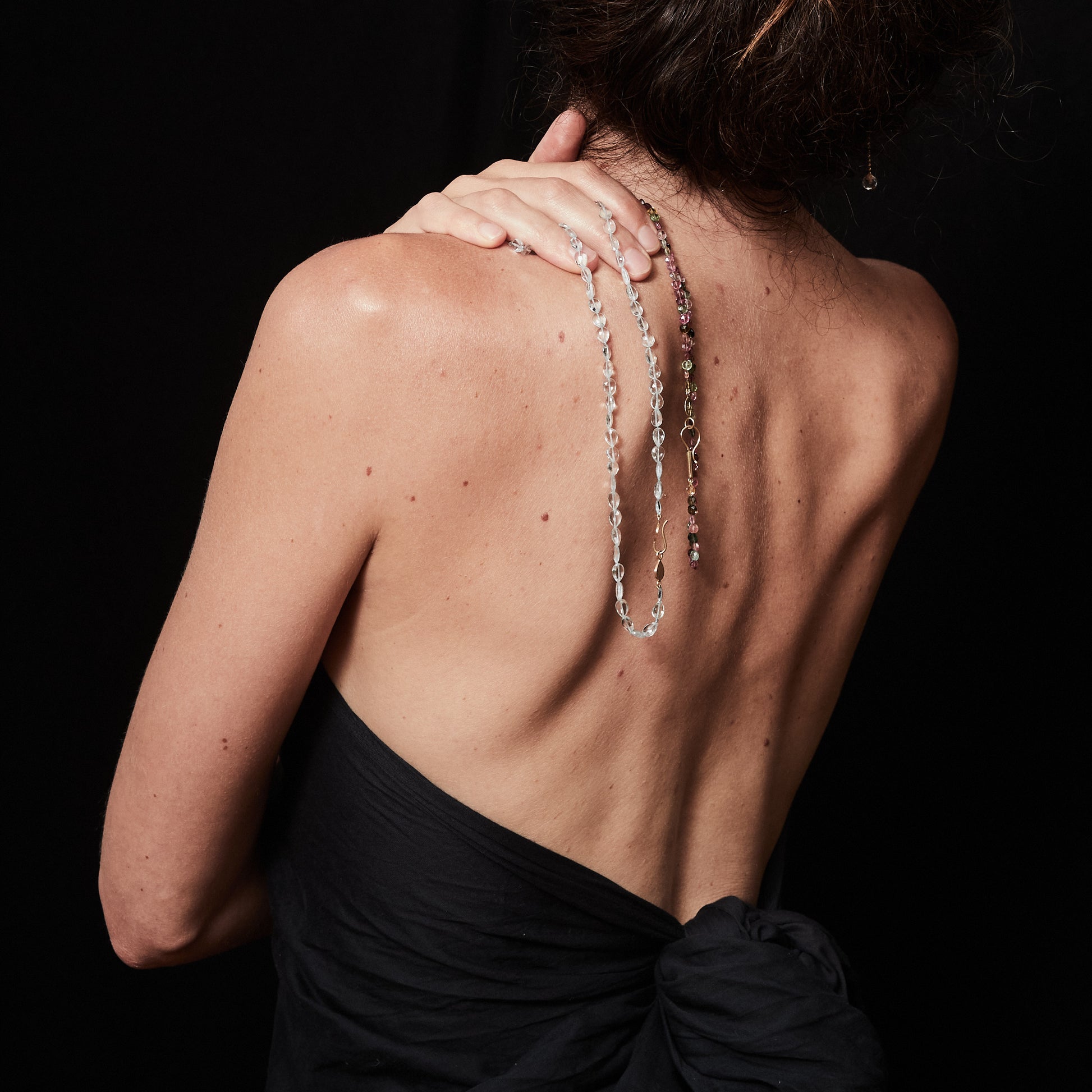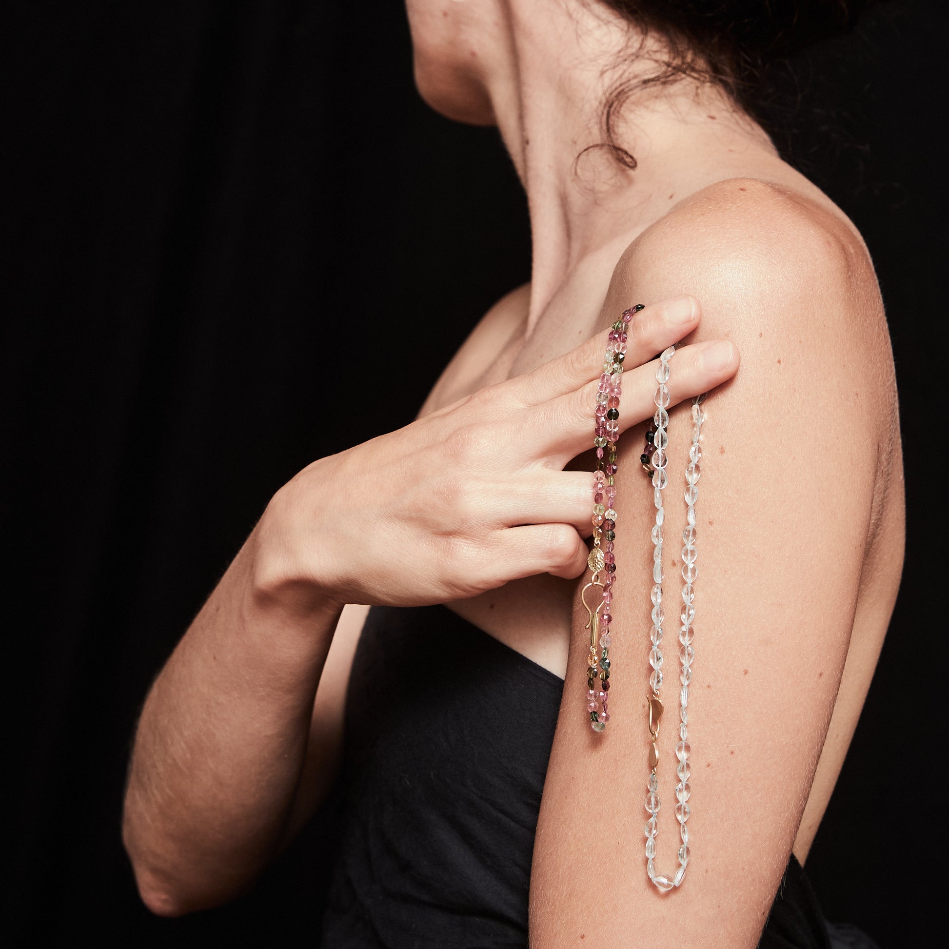 Der Verschluss ist aus 18kt Gelbgold gefertigt. Er greift die Form der Aquamarine auf und mündet in einem klassischen Haken. Der Verschluss ist das zierende Element dieser Kette und kann sowohl seitlich als auch vorne getragen werden.