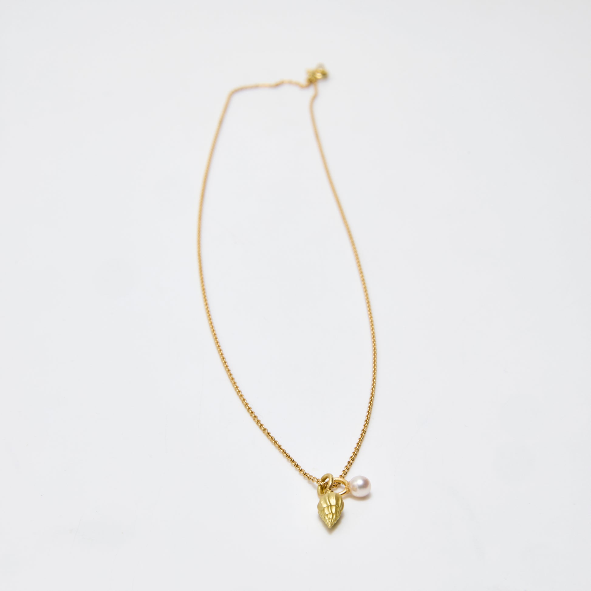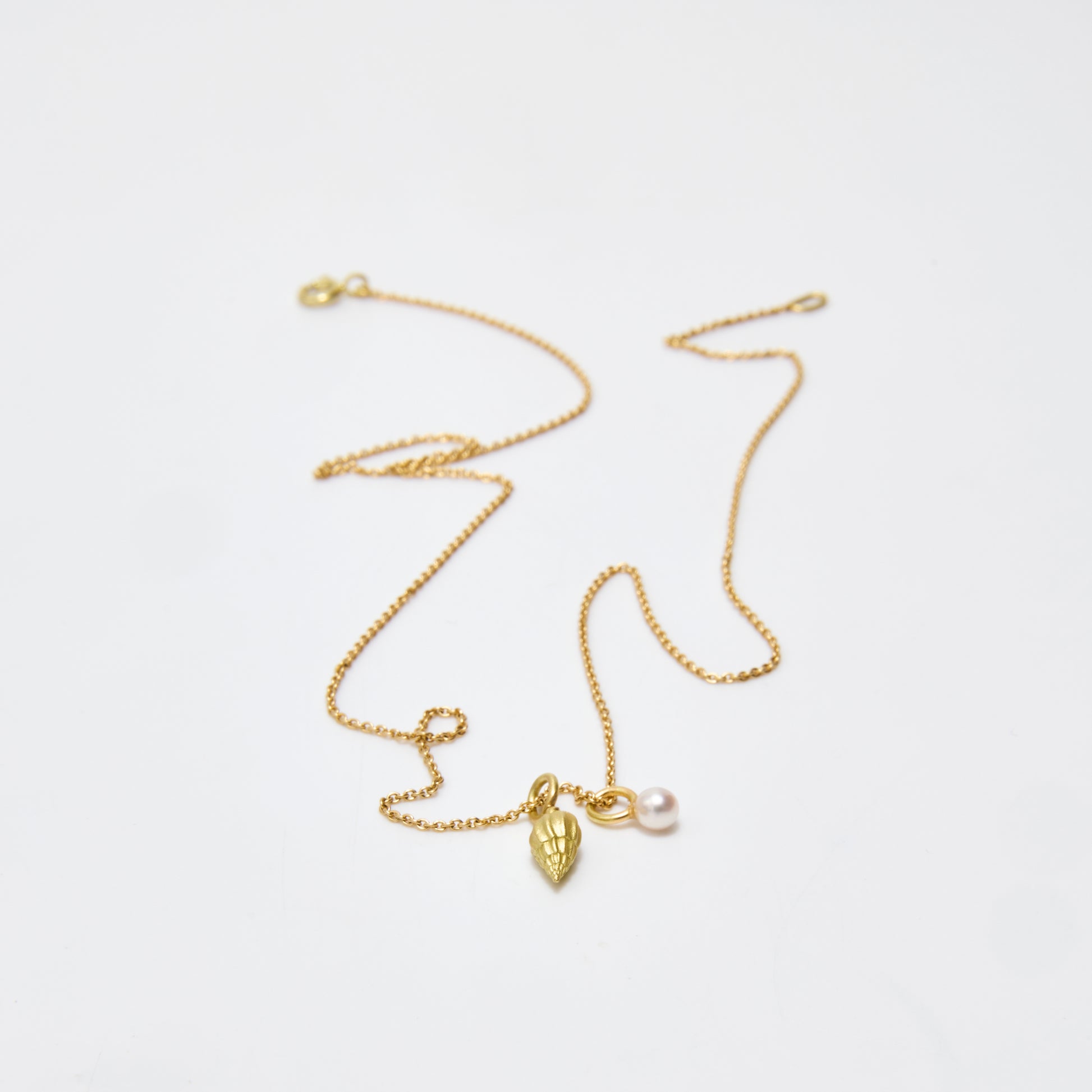 Ein Abguss einer echten kleinen Muschel und eine kleine runde Süßwasserperle.