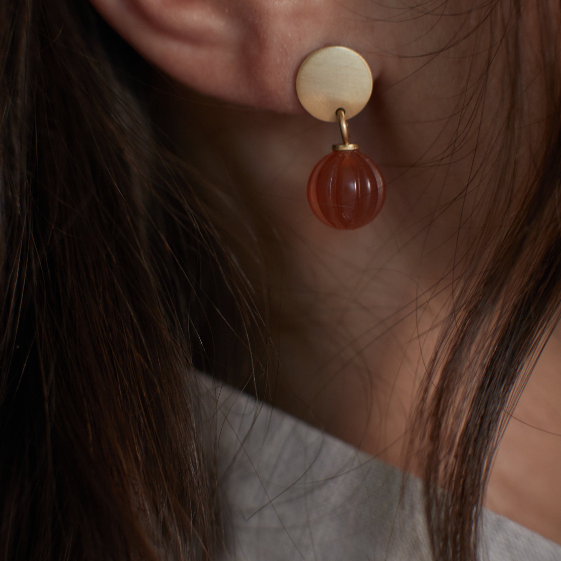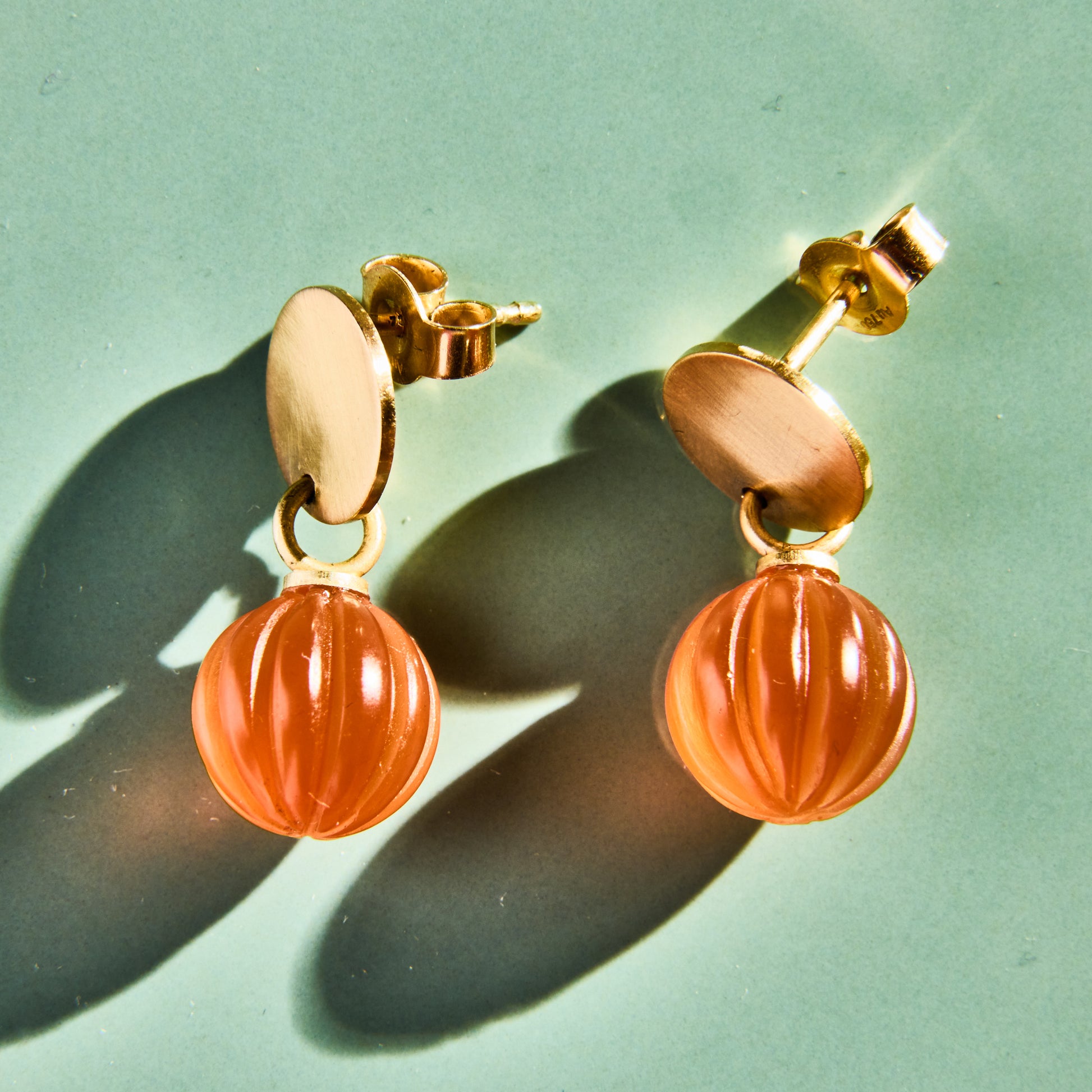Karneole und 18kt Gelbgold. Eine Traumkombination. Vor allem mit dunklem oder rötlichem Haar getragen, heben sich die gravierten Kugeln sehr elegant hervor. Die goldenen Plättchen sind leicht mattiert und verzaubern jedes Gesicht.