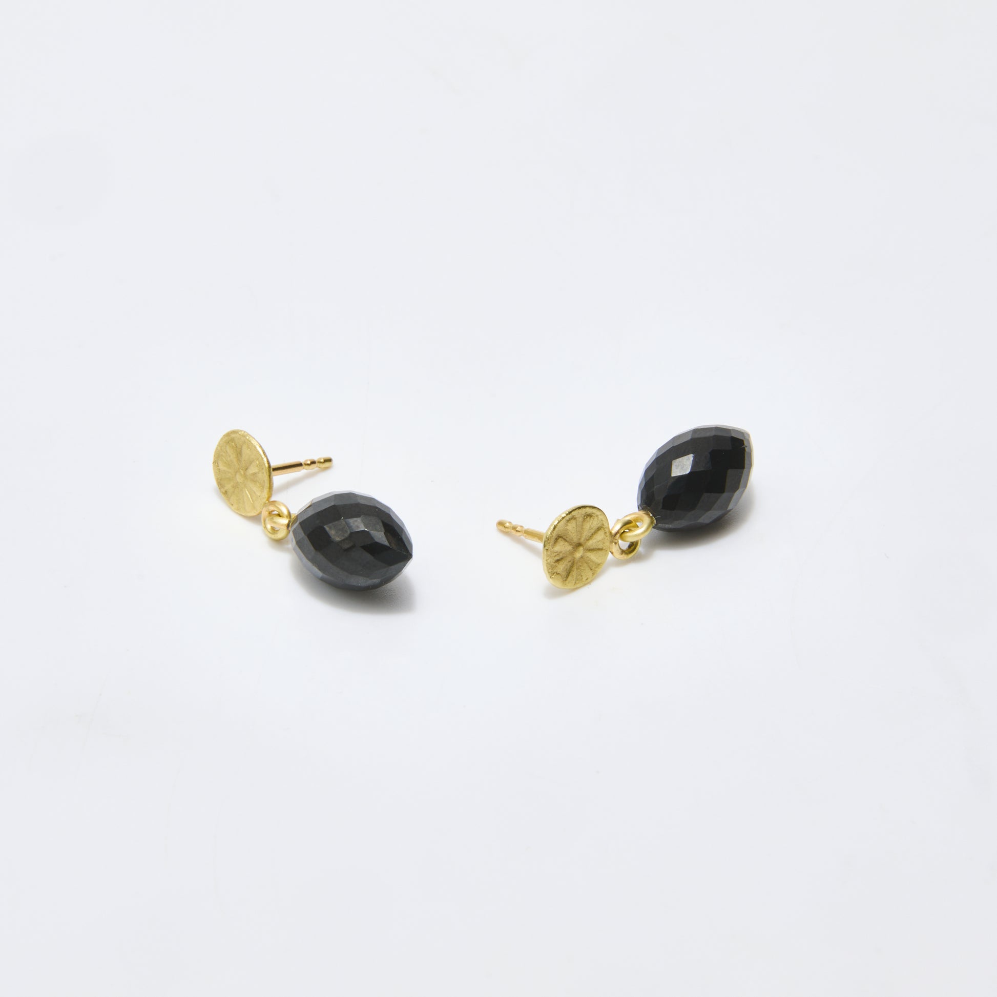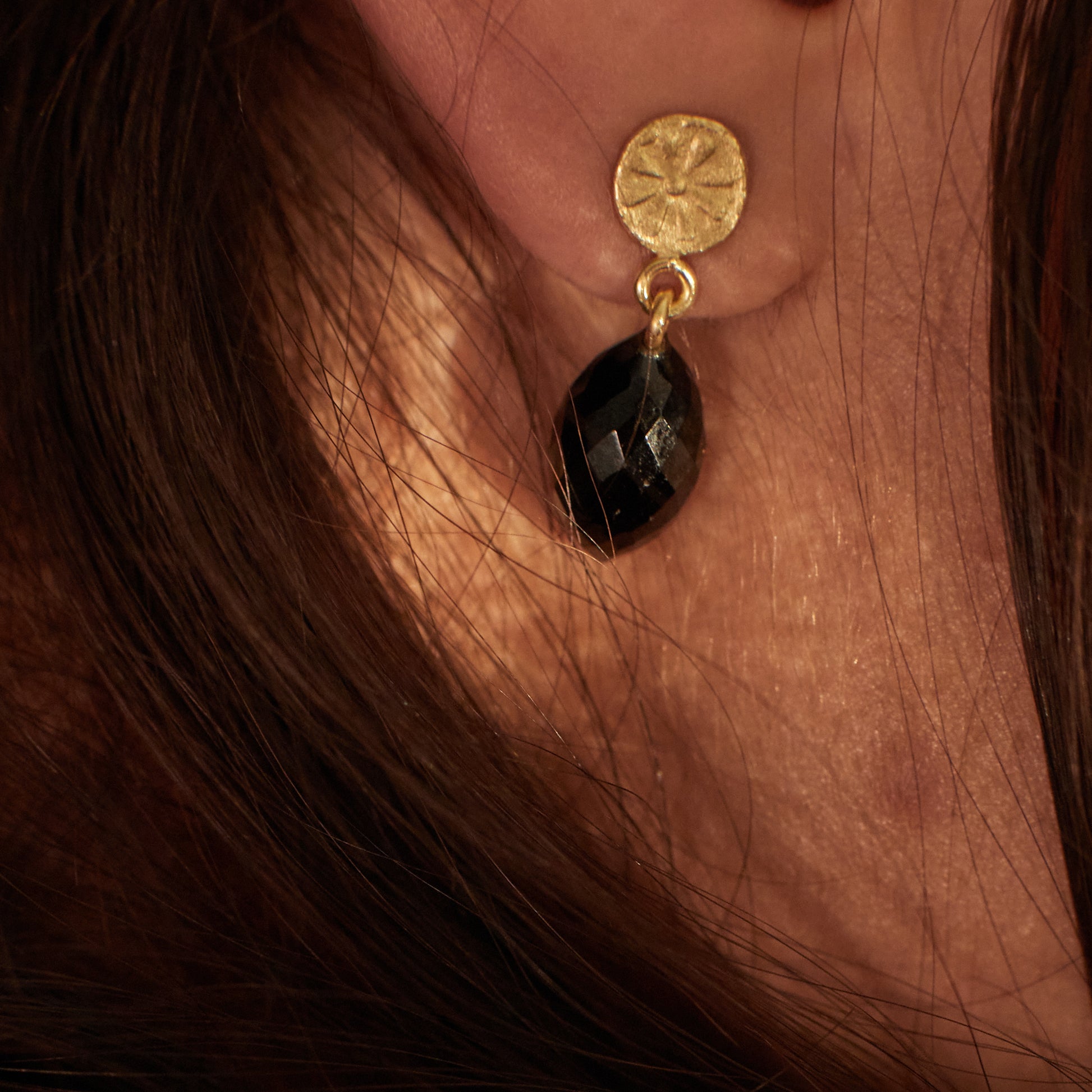 "Senta" ist ein sehr feiner und edler Ohrschmuck. Die schwarzen Turmaline haben einen schimmernden Glanz. Durch die facettierte Oberfläche der Edelsteine entsteht ein feines Lichtspiel, das zart das Gesicht des Trägers umschmeichelt. Die mattierte Oberfläche der "Blütenstecker" betont den Glanz der Turmaline.
