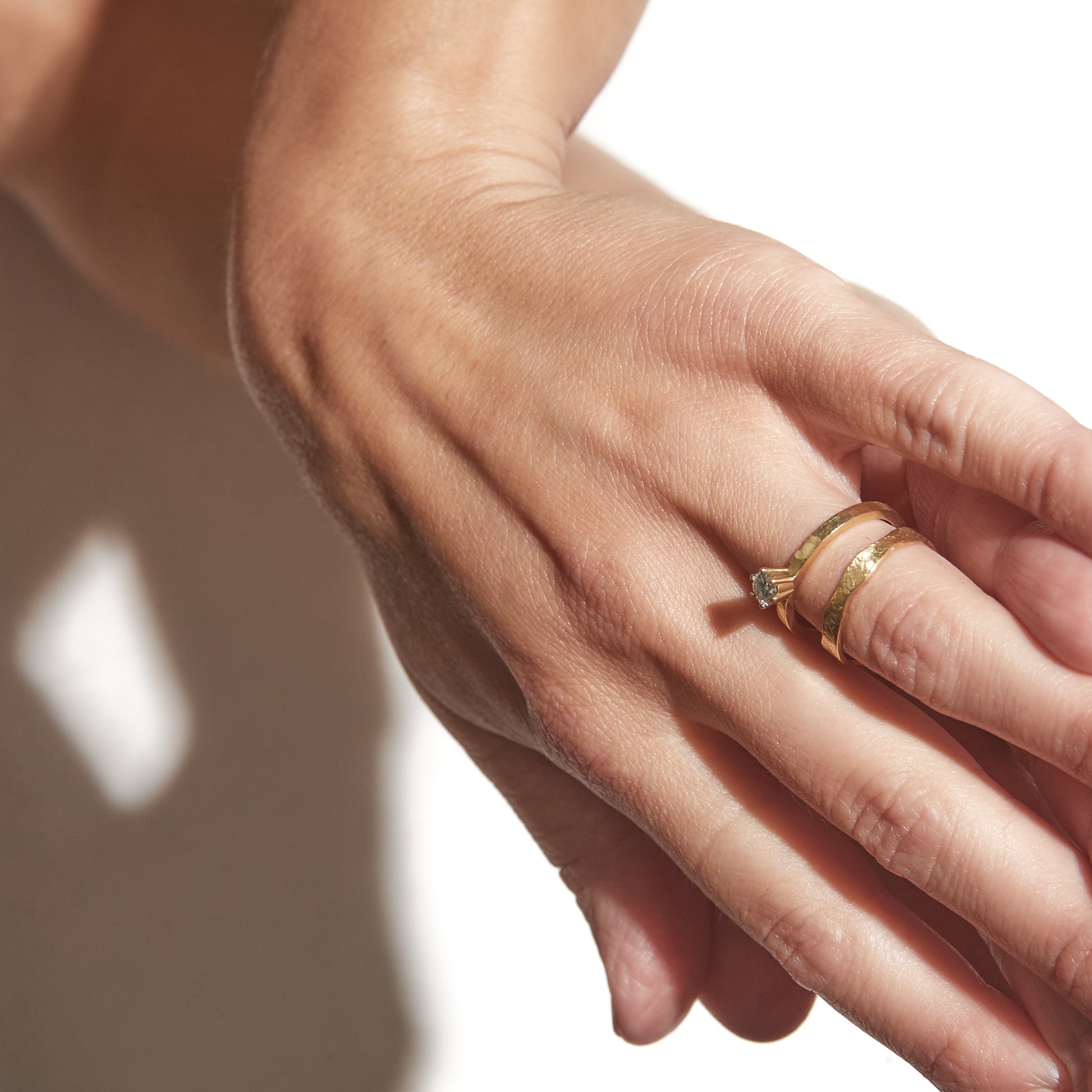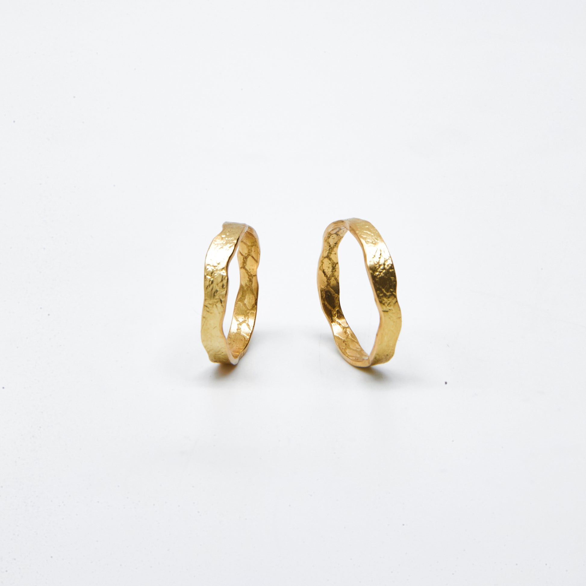 Ring "Curves" aus 18kt Gelbgold gefertigt wird mit Stoff geprägt und fällt deshalb jedesmal ganz individuell aus. Innen entsteht eine Art Wabenstruktur und außen erinnert es an Tierhaut. Nichts an diesem Ring ist gerade. Kurven, Struktur, Vertiefungen, Wölbungen.